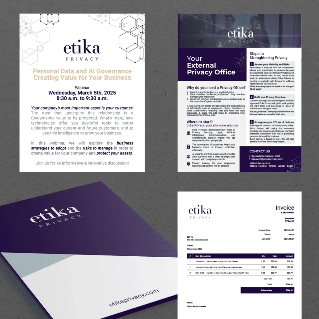 We translated Etika’s values into a brand experience that felt secure but not cold, corporate yet approachable. Every touchpoint, from business cards to banners, invoices, webinar designs, and web elements, was meticulously designed to reflect professionalism and coherence.